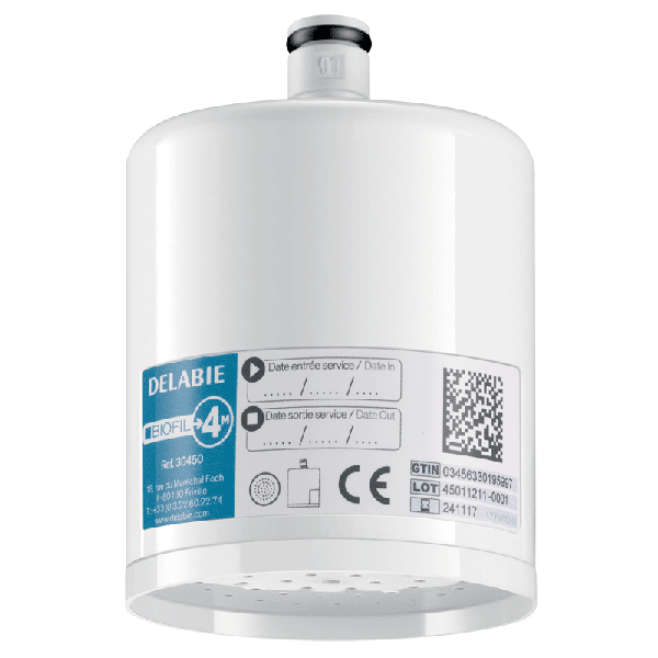 BIOFIL anti-Legionella un visu baktēriju krāna un sienas dušas filtrs, dušas aerosols. Ierīce izgatavota no ABS. Membrānas tips: cauruļveida mikrofiltrācija. Membrāna izgatavota no polietilēna. Poru nogriešanas slieksnis: 0,1 μm nominālā un 0, 2 μm absolūtā sterilizācijas pakāpe. Kvalificēts ūdens tilpums lietošanas laikā: 12 000 litri. Filtrēšanas plūsmas ātrums: 4,6 l/min pie 1 bar, 7,6 l/min pie 3 bar un 9,4 l/min pie 5 bar (tikai filtrs, izslēdz nekādus plūsmas ātruma ierobežojumus krānā). Vietu taupošs, piemērots krāniem ar zemu iztekas augstumu: H. 63mm, Ø 56mm. Kontrolēta retropiesārņojuma pārvaldība: aizsargapvalks un leņķiskais savienotājs optimālai pozicionēšanai (filtra stāvokli var regulēt tā, lai ūdens neplūst tieši uz netīrumiem). Maksimālais augšējais spiediens lietošanas vietā: 5 bāri. Maksimālais kalpošanas laiks: 4 mēneši pēc uzstādīšanas. Izturība pret termiskiem triecieniem: 70°C 30 minūtes. Izturība pret ķīmiskiem triecieniem: aktīvā hlora līmenis līdz 100 ppm 4 stundas (kumulatīvi kopā). Nesterils filtrs. CE I klases medicīnas ierīce. Iepakots atsevišķi. Jāpasūta daudzumos pa 10. Iepakots kastēs pa 10 vienībām.