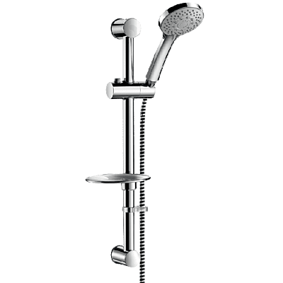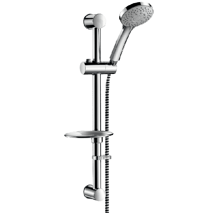 Dušas komplekts ar 5 strūklām: - hromēta nerūsējošā tērauda dušas sliede Ø 25mm, kopējais garums 580mm ar 540mm centriem, var sagriezt pēc izmēra, - bīdāms dušas galvas turētājs, regulējams augstumā un slīpums, - hromēts ziepju trauks, - gluda, BICOLOR PVC elastīga šļūtene no pārtikas kvalitātes metālplastmasas PVC, L. 1,50 m (atsauce 834T1), - pret nogulsnēm izturīga ABS hromēta dušas galva ar 5 strūklām: lietus efekts, masāžas efekts, burbuļi, masāžas un lietus efekts, burbuļu un lietus efekts (atsauce 813) - dušas šļūtenes aiztures apkakle (atsauce 830).