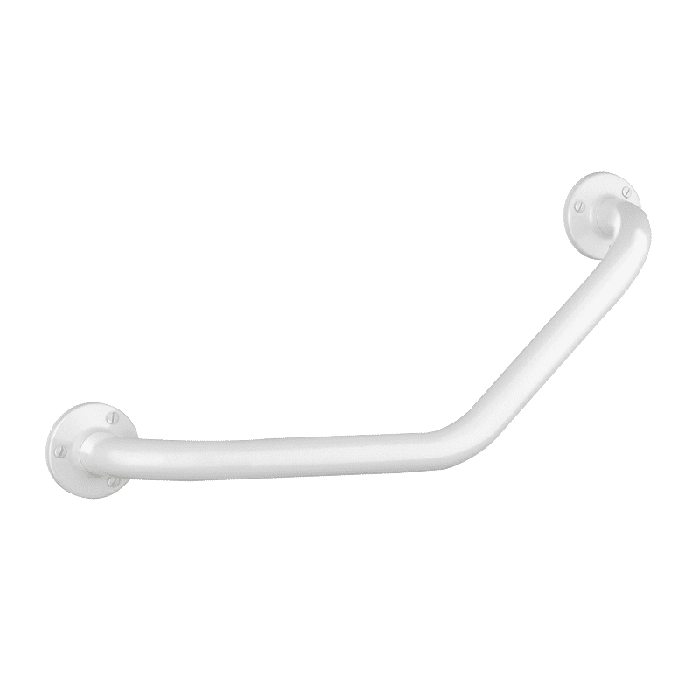 EKO leņķiskais greifers 135°, Ø 25mm, cilvēkiem ar kustību traucējumiem. Leņķveida satvērēja stienis izgatavots no nerūsējošā tērauda ar baltu pulvera pārklājumu. Izmēri: 220 x 220 mm. Redzami stiprinājumi, kas piestiprināti pie sienas ar 3 caurumu pārklājuma plāksni. 10 gadu garantija.