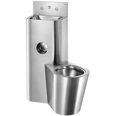 Kombinētais bloks: izlietne un uz grīdas stāvošā tualetes pods labajā pusē ar padziļinātu tualetes ruļļa turētāju. Servisa kanālu uzstādīšana (caur sienu). Bakteriostatiskais 304 nerūsējošais tērauds. Pulēta satīna apdare. Nerūsējošā tērauda vienības biezums: 2mm. Noapaļoti stūri un malas, lai uzlabotu drošību. Gluda virsma vieglai tīrīšanai. Piemērots cietumiem, policijas iecirkņiem utt. WC panna ir pilnībā piemetināta pie izlietnes, bez skrūvēm: atvieglo tīrīšanu un novērš priekšmetu paslēpšanu. Izlietne aprīkota ar laika plūsmas krānu: nerūsējošā tērauda spiedpoga un pretbloķēšanas sistēma, 7 sekunžu laika plūsma, M1/2". WC aprīkots ar laika plūsmas skalošanas vārstu, 7 sekunžu laika plūsma, M3/4". Ūdens ieplūde: izlietne M1/2", WC M3/4". Padziļināta horizontāla ūdens izvade: Ø 100mm 200 mm vītņstieni var sagriezt pēc izmēra (citi garumi pieejami pēc pieprasījuma). Svars: 30kg.