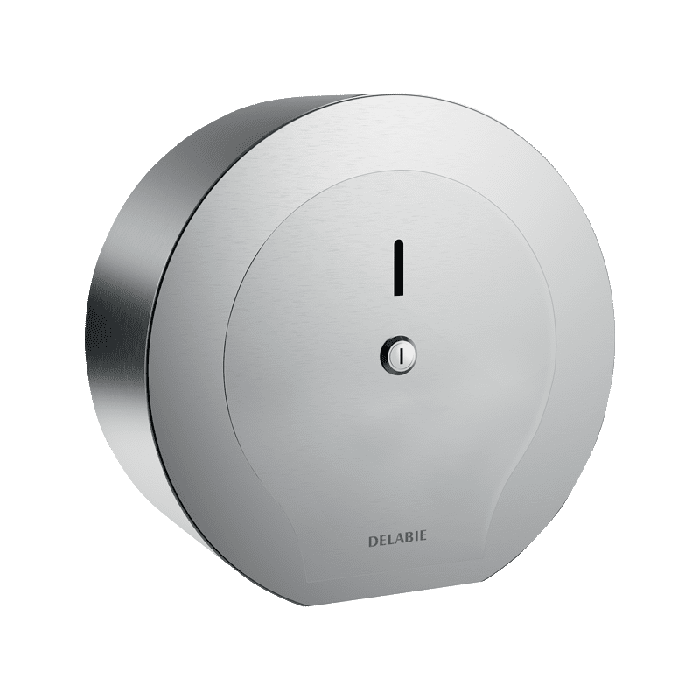 Tualetes papīra dozators. Liels modelis 400m ruļļiem. Tualetes papīra dozators izgatavots no pulēta satīna 304 nerūsējošā tērauda. Eņģes pārvalks atvieglo uzpildīšanu un uzlabo higiēnu. Ar aizmugurējo daļu: aizsargā papīru no sienu nepilnībām, mitruma un putekļiem. Ar slēdzeni un standarta DELABIE atslēgu. Līmeņa kontrole. Izmēri: Ø 310mm, dziļums 132mm. 30 gadu garantija.