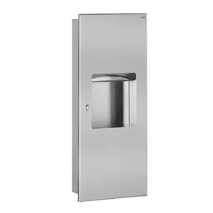 Padziļināts kombinētais papīra dvieļu dozators/tvertne. Pulēts satīna bakteriostatisks 304 nerūsējošais tērauds. Ar slēdzamām durvīm un standarta DELABIE atslēgu. Slēptie stiprinājumi. Dozatora ietilpība: 400 - 600 dvieļi. Atkritumu tvertnes tilpums: 10 litri. Nerūsējošā tērauda biezums: 1,2 mm. Izmēri: 125 x 330 x 790 mm. 30 gadu garantija.