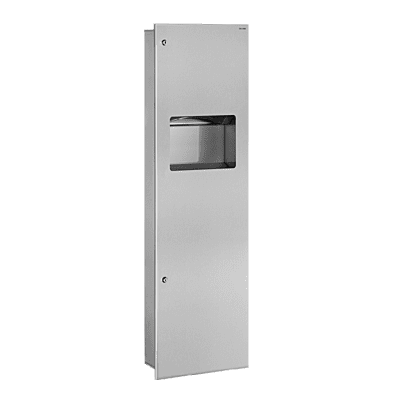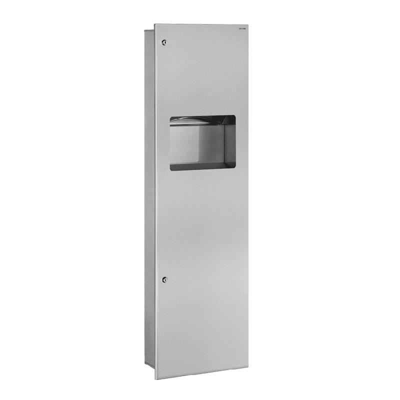 Padziļināts kombinētais papīra dvieļu dozators/tvertne. Pulēts satīna bakteriostatisks 304 nerūsējošais tērauds. Ar slēdzamām durvīm un standarta DELABIE atslēgu. Slēptie stiprinājumi. Dozatora ietilpība: 400 - 600 dvieļi. Atkritumu tvertnes tilpums: 30 litri. Nerūsējošā tērauda biezums: 1,2 mm. Izmēri: 160 x 395 x 1,395 mm. 30 gadu garantija.