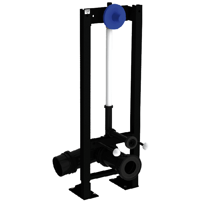Pašnesošā rāmja sistēma piekarināmiem WC podiem, komplekts 1/2: Melns pulverkrāsots tērauda rāmis: - Ar lielām kājām stiprināšanai pie nesošajām grīdām. - Rāmja augstumu var regulēt no 0 - 200mm (ar 1m atzīmi). - Sienu apdarei no 10 līdz 35 mm. - Ø 32 mm skalošanas caurule ar Ø 55 mm savienojuma paplāksni. - ABS grunts caurule, Ø 110mm HDPE izvads ar ūdensnecaurlaidīgu blīvējumu, ar 2 iestatīšanas pozīcijām. Aprīkots ar TEMPOFLUX 2 laika plūsmas tiešo skalošanu: - Skalošanas sistēma bez cisternas: tieši savienota ar cauruļvadu. - Vakuuma pārtraucējs. - Integrēts noslēgkrāns un plūsmas ātruma/tilpuma regulators. - Ciets misiņa korpuss un triecienizturīgs, pret skalu izturīgs mehānisms. - In-line ieplūde M¾". - Saderīgs ar lietus ūdeni. Tiek piegādāts iepriekš salikts. 10 gadu garantija.