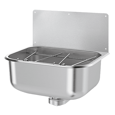 Pie sienas stiprināma izlietne ar pret šļakatu aizsardzību. Bakteriostatiskais 304 nerūsējošais tērauds. Pulēta satīna apdare. Nerūsējošā tērauda biezums: 0,9 mm. Bez šuvēm, presēta bļoda. Dziļa izlietne. Gluda virsma. Noapaļotas malas novērš savainojumus. Apgādāts ar 1½" iztekām. Bez pārplūdes. Apgādāts ar fiksācijas elementiem un pret šļakatu paneli. Var uzstādīt ar nerūsējošā tērauda eņģu režģi (atsauce 102400). Svars: 4,6 kg. 30 gadu garantija.