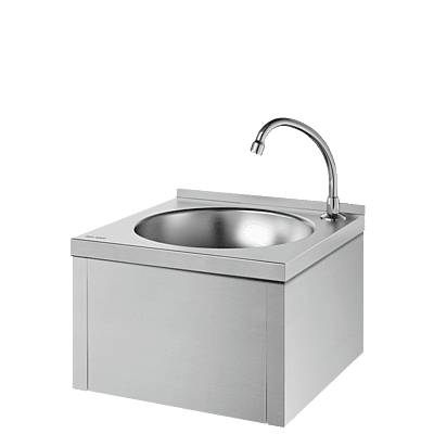 Pie sienas stiprināma, ar ceļiem darbināma rokas izlietne. Bakteriostatiskais 304 nerūsējošais tērauds. Nerūsējošā tērauda biezums: 0,8 mm. Noapaļotas malas novērš savainojumus. Bez šļakatām. Apgādāts ar gulbja kakla izteku, mīksta pieskāriena darbības laika plūsmas krānu ar 7 sekunžu laika plūsmu un priekšmaisītāju ar pretvārstiem. Ir pieejama tukša versija (t.i., bez krāna) (atsauce 181310). Plakani perforēta izteka, bez skrūvēm: viegli tīrāmi un izturīgi pret vandāļiem. Ūdens taupīšana: plūsmas ātrums iepriekš iestatīts uz 3 lpm. Maksimāla higiēna: nav manuāla kontakta ar krānu. Bez pārplūdes. Apgādāts ar fiksācijas elementiem. CE marķējums. Atbilst Eiropas standartam EN 14688. Svars: 4,3 kg. 30 gadu garantija.