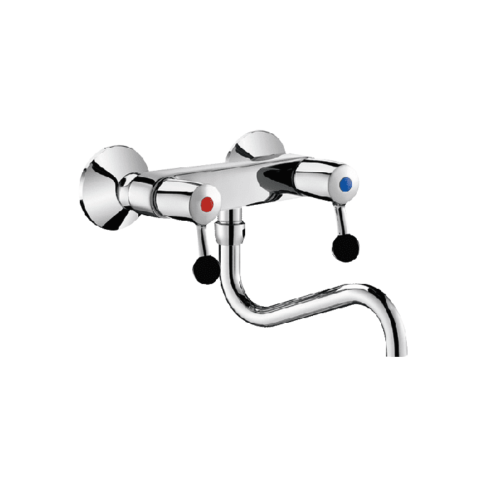 Pie sienas stiprināms divu caurumu maisītājs ar grozāmu, cauruļveida zem snīpi Ø 22mm L. 200mm ar zvaigžņveida misiņa plūsmas taisnotāju. Bezūdens, vadāmas vārstu galviņas ar pastiprinātiem mehānismiem. Triecienizturīgas, ergonomiskas lodīšu sviras. Plūsmas ātrums 60 l/min pie 3 bāriem sasniegts 90° robežās. Pilns plūsmas ātrums 90 l/min pie 3 bāriem. Izteka ar gludu iekšpusi. Viengabala korpuss un snīpis izgatavoti no hromēta misiņa. M1/2" M3/4" nobīdes savienotāji, kas tiek piegādāti ar apšuvumiem. Piemērots utilizācijas izlietnēm. 10 gadu garantija.