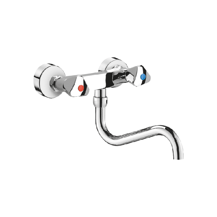 Pie sienas stiprināms mehāniskās izlietnes maisītājs ar grozāmu, Ø 22mm cauruļveida apakštekni L. 200mm ar zvaigznes formas, misiņa plūsmas taisnotāju. Izteka ar gludu iekšpusi (samazināta baktēriju attīstība). Plūsmas ātrums 45 lpm pie 3 bāriem. Hromētas metāla vadības pogas ar keramiskām vārstu galviņām. Apgādāts ar nobīdes standarta savienotājiem, M1/2" M3/4". 10 gadu garantija.
