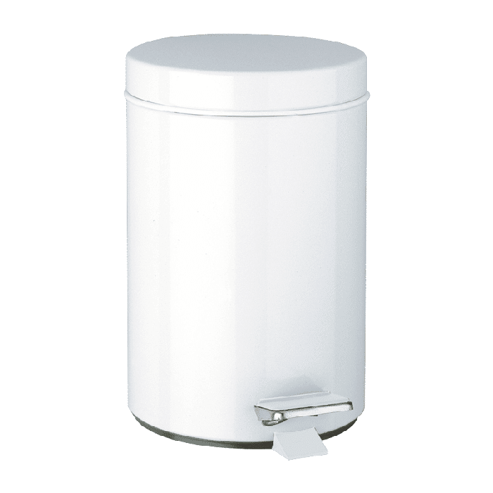 Apaļa pedāļa tvertne. Ar iekšējo spaini. Tilpums 3 litri. Lietošanai ar 5 litru maisiem. Balta pulvera pārklājuma apdare. Izmēri: Ø 170mm, augstums 265mm. 10 gadu garantija.