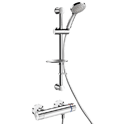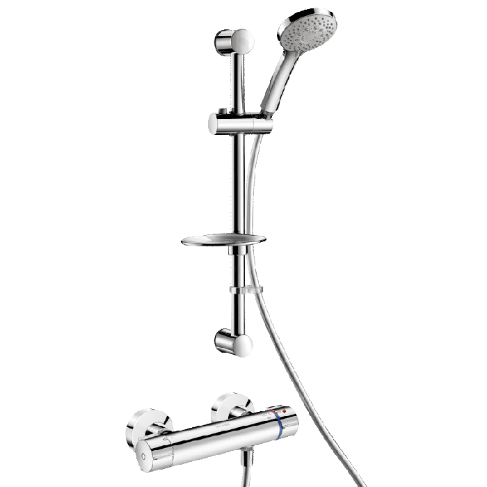 Dušas stāvvada sliede ar dubultās vadības termostata dušas maisītāju. Dušas komplekts ar SECURITHERM termostatisko dušas maisītāju. Termostatiskais maisītājs bez pretvārstiem uz ieplūdes atverēm (samazināta baktēriju vairošanās). Nav šķērsplūsmas riska starp karsto un auksto ūdeni. Mikseris ar pretpiedeguma drošumu: automātiski izslēdzas, ja aukstā ūdens padeve neizdodas. Novērš aukstu dušu: automātiski izslēdzas, ja karstā ūdens padeve neizdodas. Securitouch siltumizolācija novērš apdegumus. No kaļķakmens izturīga termostata kasetne temperatūras regulēšanai. ¼ pagrieziena keramikas galva plūsmas ātruma regulēšanai. Temperatūras kontrole līdz 43°C. Dubultais temperatūras ierobežotājs: 1. ierobežotājs, kas iestatīts uz 41°C, var tikt ignorēts, 2. ierobežotājs iestatīts uz 43°C. Termiskie triecieni ir iespējami, nenoņemot vadības pogu vai neizslēdzot aukstā ūdens padevi. Plūsmas ātrums ierobežots līdz 9 lpm pie 3 bāriem. Hromēts misiņa korpuss ar ergonomiskām vadības ierīcēm. M½" dušas izvads. F¾" ieplūdes atveres ar integrētiem filtriem. Mikseris tiek piegādāts ar nobīdītiem standarta sienas savienotājiem M½" M¾". • Bīdāms dušas galvas turētājs (atsauce 813) uz hromētas stāvvada sliedes (atsauce 821) ar ziepju trauku un elastīgu šļūteni (atsauce 836T1). • Dušas galvas stiprinājuma apkakle (830. atsauce). Mikseris ideāli piemērots veselības aprūpes iestādēm, pansionātiem un aprūpes namiem, slimnīcām un klīnikām. Mikseris piemērots cilvēkiem ar kustību traucējumiem. Dušas komplekts ar 10 gadu garantiju.