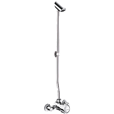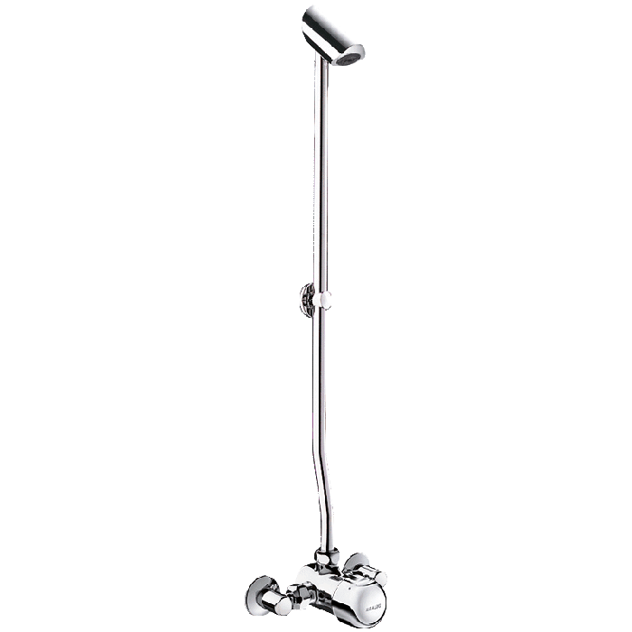 Laika plūsmas dušas komplekts atklātai uzstādīšanai: TEMPOMIX ¾" vienas kontroles mikseris. Uzstādīšana pie sienas. Temperatūras kontrole un darbība, izmantojot spiedpogu. Maksimālās temperatūras ierobežotājs (var regulēt uzstādītājs). Mīksta pieskāriena darbība. Laika plūsma ~30 sekundes. Plūsmas ātrums 6 lpm pie 3 bāriem. Hromēta, pret vandālismu izturīga, pret katlakmeni noturīga TONIC JET dušas galva ar automātisku plūsmas ātruma regulēšanu. Hromēts ciets misiņš. Integrēti pretvārsti un filtri. Dušas kolonna Ø 16mm un apkakle (komplektā iekļauts montāžas kronšteins un skrūves). Hromēta metāla spiedpoga. Elkoņu savienojumi M½", 150 mm centri. 30 gadu garantija.