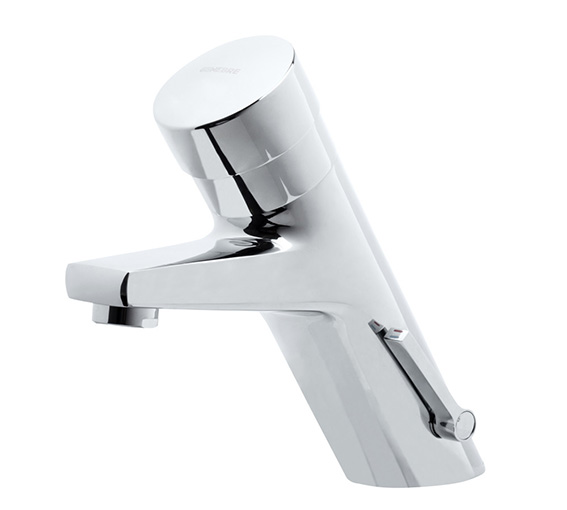 Izlietnes jaucējkrāns ar laika regulēšanu, kas paredzēts uzstādīšanai uz darba virsmas.
