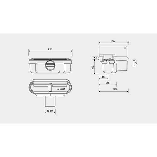 Horizontālā izeja t.sk. noņemams ūdens slazds, kuru var izjaukt tīrīšanai, var pagriezt par 180 grādiem, ja nepieciešama uz aizmuguri vērsta izvada. Ūdens slazdam ir 50 mm ūdens blīvējums. Piezīme: īpaši zems uzstādīšanas augstums un VA apstiprināts